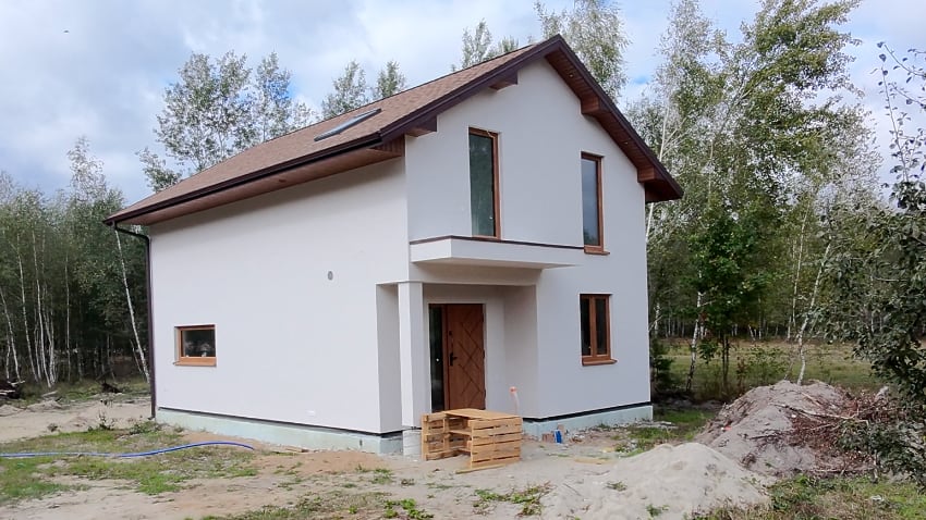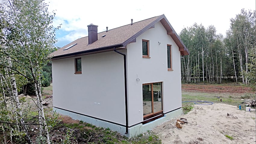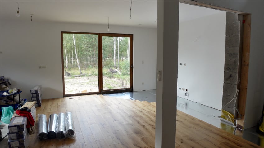 Dom w ciągu sześciu miesięcy doprowadziliśmy do stanu deweloperskiego zamkniętego. W tym okresie wykonaliśmy w nim również wszystkie instalacje, jak wentylacyjną (z rekuperatorem), elektryczną, wodno-kanalizacyjną i grzewczą, którą przygotowaliśmy do montażu jednostki centralnej pompy ciepła w wariancie powietrze-woda. Z uwagi na ogrzewanie podłogowe, na poddaszu użytkowym, po uprzednim ułożeniu instalacji rurek wody, wykonaliśmy wylewkę z betonu jastrychowego. Dzięki niej będzie można korzystać z zalet „podłogówki” na drewnianym stropie, a ponadto, górna kondygnacja będzie lepiej tłumiła pionowe przecieki akustyczne do części parterowej.