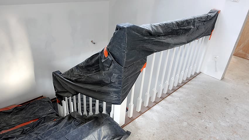 Widok na dębowe schody zabiegowe z górnego hallu. Trepy i poręcze zabezpieczyliśmy przed porysowaniem na czas prac wykończeniowych.