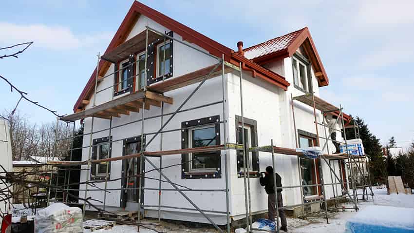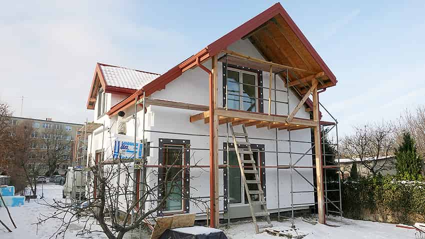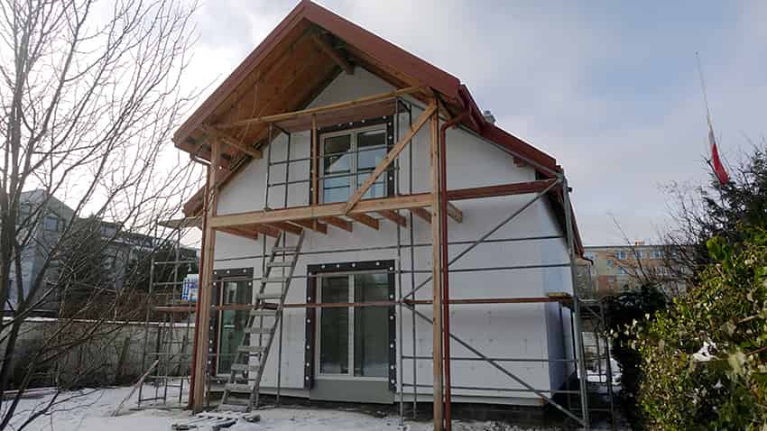 Z kolei na zewnątrz wykonujemy izolację termiczną ze styropianu ryflowanego, którą pokryjemy strukturą z tynku silikatowo-silikonowego, odpornego na kurz i zanieczyszczenia biologiczne. Ten rodzaj tynku po upływie lat znacznie ułatwia również czyszczenie elewacji. Do dokończenia pozostała nam także konstrukcja balkonowa, tj. wykonanie izolacji przeciwwilgociowej, posadzki, obróbek blacharskich i balustrady. Na ostatnim etapie zamontujemy podbitki dachowe z PCV.