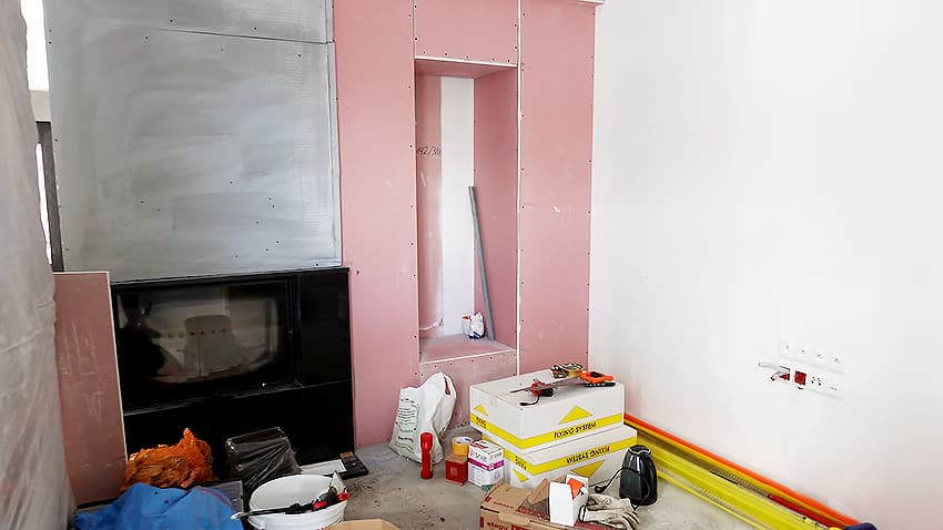 Rozpoczęta zabudowa wkładu kominkowego z ognioodpornych płyt karton-gips typ DF oraz płyt krzemianowo wapiennych. Od zewnątrz ich powierzchnie wykończymy ozdobnymi płytkami kamiennymi.
