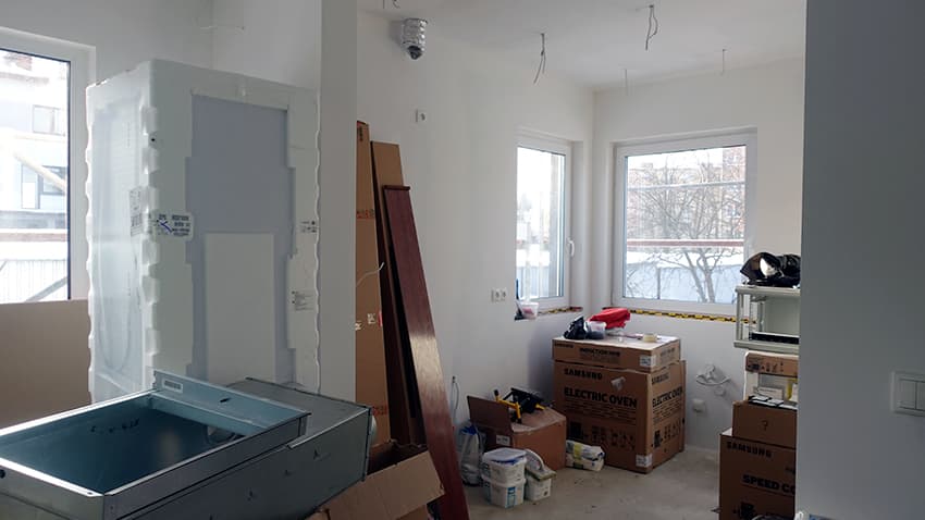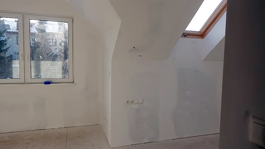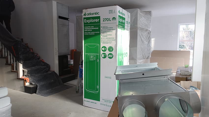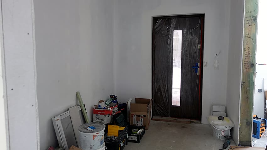 W tej chwili we wnętrzu domu trwają pierwsze prace wykończeniowe i instalacja jednostek centralnych: gruntowej pompy ciepła, rekuperatora oraz termy wody z własną pompą powietrze-woda.