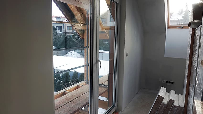 Drzwi wyjściowe na balkon z sypialni na poddaszu.