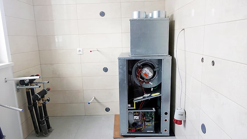 Pomieszczenie techniczne na parterze. Na zdjęciu widać jednostkę centralną gruntowej pompy ciepła amerykańskiej firmy WaterFurnace® ze zdjętą zabudową na czas instalacji.