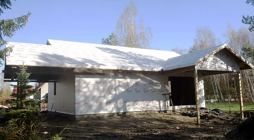 - Dom budujemy według gotowego projektu architektonicznego "słodki tradycyjny", który dostosowaliśmy do technologii szkieletowej. Pierwotny projekt zmodyfikowaliśmy dodając do niego wiatę samochodową od strony elewacji bocznej-prawej (zachodniej).